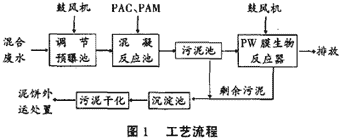 混合廢水通過格柵,大顆�?沙凉腆w及漂浮物被攔截,進入調節池,經調節水量、水質和預曝氣后用泵輸送至混凝反應池,分別加入適量的PAC、PAM溶液進行混凝和絮凝反應,反應液自流入沉淀池進行固液分離。經過上述預處理的廢水上清液溢流進入PW-W膜生物反應器,在充氧曝氣和微生物的作用下將有機物降解為二氧化碳和水,并由膜組件進行固液分離,處理后廢水達標排放。