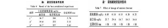 合分析,確定適合于含油廢水分離的比較佳條件為:聚合硫酸鐵為0.4mg L,pH始為3.0,pH終為7.0,聚丙烯酰胺為80mg L,腐植酸鈉為0.20mg L,在該條件下,凈化后水中油含量為4.5mg L,化學耗氧量為61.5mg L,沉降時間為2min。比較后以1#、2#、3#水樣做實驗,結果如表8。