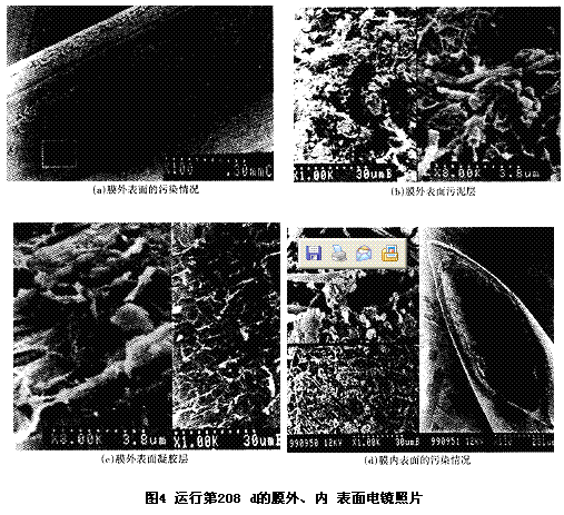 ⑤電鏡觀察表明,膜外表面污泥層的沉積、凝膠層的增厚和膜內(nèi)表面微生物的滋生是造成 膜污染的主要原因。