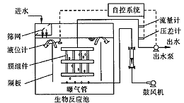 一體式中空纖維膜—生物反應(yīng)器的中試裝置設(shè)在清華大學(xué)東北浴室附近,用于處理學(xué)生浴室的洗浴污水,其工藝流程如圖1所示。整個(gè)裝置主要由生物反應(yīng)池和膜組件兩部分組成。生物反應(yīng)池尺寸為0.9 m×0.93 m×2 m,有效容積為1.5 m3,內(nèi)部被隔板分為升流區(qū)和降 流區(qū)兩部分。聚乙烯中空纖維微濾膜組件共有8塊,膜總面積32m2,分兩層置于反應(yīng)池升 流區(qū)。膜組件下設(shè)有穿孔管,曝氣量控制在35~50 m3/h。壓差計(jì)用于監(jiān)測(cè)在運(yùn)行過(guò)程 中膜過(guò)濾壓差的變化。液位控制器用于控制生物反應(yīng)池液面使之恒定。電子流量計(jì)用于測(cè)定膜出水的瞬時(shí)流量和累計(jì)流量。