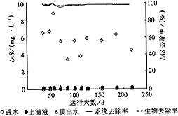以上結(jié)果說(shuō)明LAS的去除主要靠生物反應(yīng)池中微生物的分解作用,膜對(duì)LAS的截留作用很小。