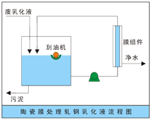 通常采用的主要處理手段是氧化氣浮破乳工藝和有機(jī)膜過(guò)濾法,氧化氣浮破乳法出水含油量高,破乳后的油不能回收,利用價(jià)值低,且達(dá)不到環(huán)保要求;有機(jī)膜處理方法設(shè)備投資大,處理成本高,運(yùn)行能耗高,清洗費(fèi)用大,清洗劑還造成二次污染。 公司經(jīng)過(guò)長(zhǎng)期實(shí)驗(yàn)研究,開發(fā)出陶瓷膜處理軋鋼乳化液廢水技術(shù),取得了良好的應(yīng)用效果。