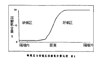 OCO工藝的一個主要特點是:好氧區與缺氧區之間的污水交換,即內回流不需泵送,以上兩個區域之間有一段是相通的。兩者之間的交換形式及量的大小是依靠攪拌器的控【水處理技術】制來實施,因此節省能耗。當攪拌器運轉時,湍流增強,好氧區與缺氧區混合程度增強,當攪拌器停止運轉時,兩區之間的混合程度較低。此時測得的溶氧狀況如圖2所示,好氧區與缺氧區的區分很明顯。OCO反應池的構造和攪拌器的循環工作可保證好氧區和缺氧區之間很高的回流比,這種頻繁的變化是該工藝有效脫氮的關鍵之一。