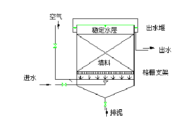 池體的作用除了進行凈化污水外,還要考慮填料,布水、布氣等設施的安裝。當池體容積較小時,可采用圓形鋼結構,池體容積較大時可采用矩形鋼筋混凝土結構。池體的平面尺寸以滿足布水、布氣均勻,填料安裝、維護管理方便為準。池體的底壁須有支承填料的框架和進水進氣管的支座。池體厚度根據池的結構強度要求來計算。高度則由填料、布水布氣層、穩定水層以及超高的高度來計算。同時,還必須考慮到充氧設備的供氣壓力或提升高度。一般總池高在3.5~6.0m左右。