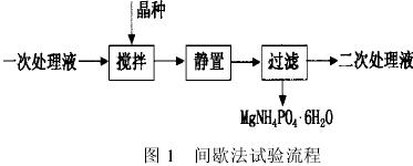 a)用化學沉淀法處理高含磷廢水時,一次處理液中的磷濃度不能達到國家Ⅱ類水排放標準。我們以化學沉淀所得的MgNH4PO4•6H2O為晶種,采用晶析法輔助化學沉淀法進行處理,試驗表明,連續法優于間歇法。采用連續法時,一次處理液放置時間2.7h,水力停留時間維持在0.1h左右,二次處理液的磷濃度就可以達到國家Ⅱ類水排放標準。