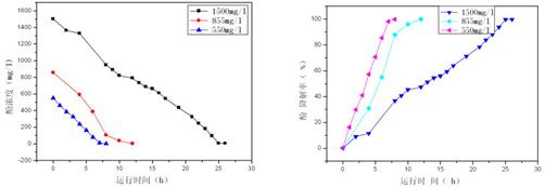 圖為相同的MLSS=3500mg•L-1,pH=7.2,T=25ºC,不同初始濃度下苯酚濃度與時間的關系圖,從圖中看出,酚初始濃度為550 mg•L-1時,經過8h時,酚初始濃度為855 mg•L-1時,經過12h,酚初始濃度為1500 mg•L-1時,苯酚經過26h,苯酚降解完全,降解率達到99%以上。