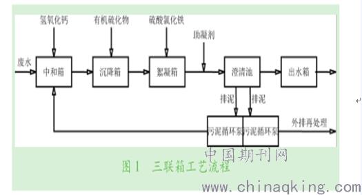 三聯(lián)箱技術(shù)作為國(guó)內(nèi)的脫硫廢水處理應(yīng)用比較多的一種工藝技術(shù),包含“絮凝—沉淀—中和”,具體工藝流程如圖1所示。脫硫廢水經(jīng)加堿(氫氧化鈉或氫氧化鈣)中和后,再加入有機(jī)硫、硫酸氯化鐵等絮凝劑以及助凝劑等藥品將脫硫廢水中的懸浮物及重金屬沉淀去除。沉淀的污泥經(jīng)脫水處理后運(yùn)至渣場(chǎng)進(jìn)行綜合處理,處理出水則經(jīng)pH調(diào)節(jié)后進(jìn)行排放。三聯(lián)箱技術(shù)是國(guó)內(nèi)普遍采用的脫硫廢水處理工藝,廢水含固量大成為制約該工藝發(fā)展的重要因素,不僅導(dǎo)致設(shè)備故障率高,運(yùn)行穩(wěn)定性差,而且需要添加大量藥劑,增加運(yùn)行成本。