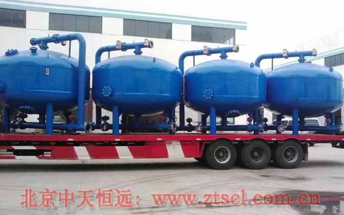 3.過濾水量大,過濾效果好,過濾流速快,正常濾速可在40m/h左右,根據水質可達60m/h;過濾器反洗采用產品水,且不必設增壓泵和反洗泵;反洗歷時2-3min,反洗水量<3立方米。過濾精度高,雜質過濾精度可在0.10mm以下,出水濁度可小于0.5NTU。過濾系統由標準單元砂缸組成,過濾流量可從30.6立方米/小時增至2500立方米/小時。